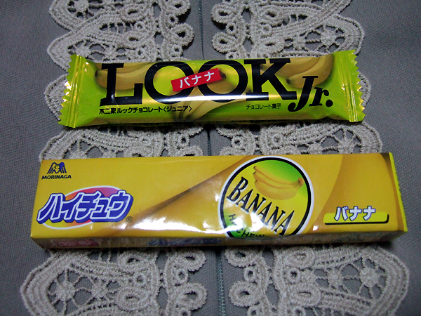 上がルックJrのバナナ味、下がハイチュウバナナ味。